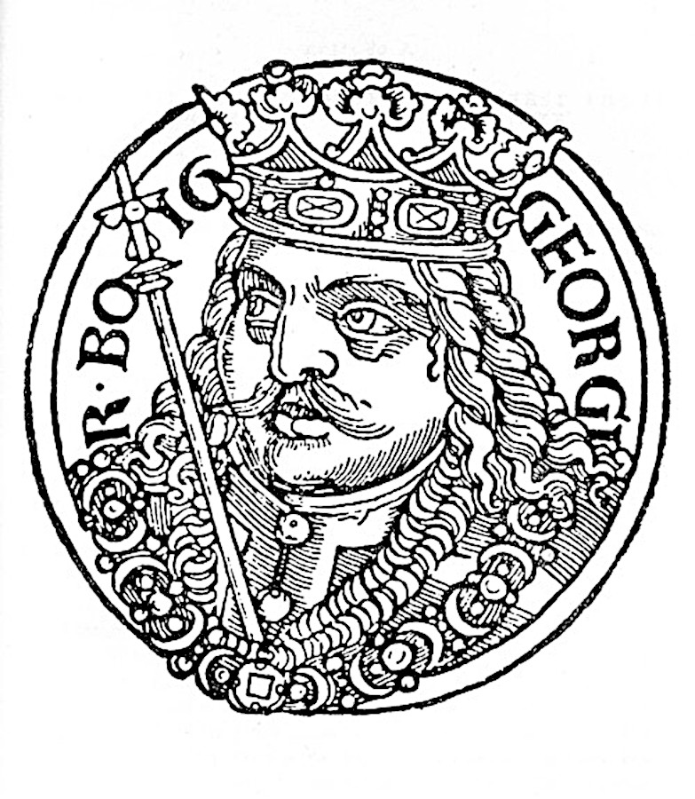 vlastním jménem Jiřík z Kunštátu a Poděbrad *23.4.1420, zemřel 22.3.1471 Praha. Byl jediným českým králem, který nepocházel z panovnické dynastie, ale z domácí šlechty. Byl nazýván husitským králem. Byl syn husitského válečníka Viktorína z Poděbrad, jeho matka je neznámá. Do veřejného života vstoupil v 17 letech. Zapojil se do bojů o Tábor. 1440 byl zvolen jedním ze dvou hejtmanů Boleslavského kraje. 1444 převzal vedení celého seskupení východočeských kališníků. V roce 1448 využil nepřítomnosti vůdce katolické opozice Oldřicha z Rožmberka v zemi a jako nejvyšší hejtman ovládl Prahu. Do Prahy se tak mohl vrátit Jan Rokycana jako správce veškerého duchovenstva podobojí. 1457 zemřel Ladislav Pohrobek. 1458 oznámil Jiří z Poděbrad svou kandidaturu. 1458 byl zvolen českým králem, který vzbuzoval respekt. V zemi byl pořádek, hospodářství se rozvíjelo, podporoval rozvoj měst jako základny své moci. Jiří už dlouho předvídal, že dojde ke střetu s papežem. Marná a předčasná byla jeho snaha vytvořit společenství národů. Uherský král Matyáš Korvín, bývalý Jiříkův zeť 1468 vyhlásil Jiřímu válku a zahájil útok na Moravu. 1468 ztratil Jiří většinu Moravy a Matyáš postupoval do Čech. Jiříkovi se podařilo útok zastavit a uherská vojska obklíčit u Vilémova ve východních Čechách. 1469 došlo k jednání obou panovníků. Není známo, co Matyáš kromě zastavení dalších bojů přislíbil, nicméně Jiří ho propustil i s vojskem. Matyáš se však dva měsíce poté (3. května 1469) nechal katolickou šlechtou zvolit v Olomouci za českého krále a došlo k dvojvládí. 1471 se však Jiříkův zdravotní stav výrazně zhoršil a 22. března zemřel. Pohřben byl v královské hrobce v chrámu sv.Víta.