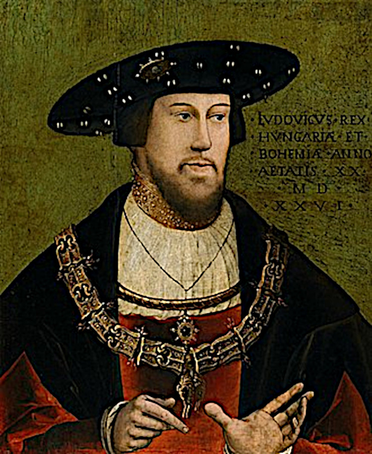 *1.7.1506 Budín, zemřel 29.8.1526 Moháč ve věku 20let. V době Vladislavovy smrti bylo Ludvíkovi deset let. Jeho otec, který byl dlouhá léta vážně nemocný, jej však dokázal navzdory svojí vnitropolitické bezmocnosti prosadit a nechat korunovat již roku 1508 za uherského krále a o rok později také za krále českého. Poručníkem nezletilého panovníka se až do jeho dospělosti stal polský král a litevský velkokníže Zikmund I. Starý, Vladislavův nejmladší bratr, a římský císař Maxmilián I. Ludvík pobýval především v uherském Budíně, do Čech zavítal jen výjimečně. Stejně jako český stát zmítaly se také Uhry za jagellonské vlády v naprosté anarchii. Na stavovském sněmu získala převahu střední šlechta, která měla prvotní zájem na zvyšování povinností poddaných, což vedlo k formování a utužování tzv. druhého nevolnictví. V době Ludvíkovy nezletilosti měli zemi spravovat místodržící ostřihomský arcibiskup kardinál Tomáš Bakócs, Jan Bornemisza a Jiří Braniborsko-Ansbašský. Sebevědomá šlechta, nesnášející cizince, jim však vůbec nedovolila ujmout se regentské vlády a zvolila si vlastní regentskou radu, která se skládala z šestnácti zemanů, šesti církevních prelátů a šesti baronů. Počátkem roku 1526 přišly do Uher zvěsti o přípravách Turků na válku. Ludvík se obrátil o pomoc na řadu evropských vládců, významnou podporu nezískal. Ludvíkovi se nepodařilo postavit dostatečně velkou armádu, pomoc přišly jenom pomocné oddíly z Čech a Moravy. Srážka křesťanského vojska s více než dvojnásobně početnou a výborně vycvičenou armádou tureckého sultána Sulejmana I. dopadla katastrofálně. Dne 29.8.1526 bylo uherské vojsko rozdrceno v bitvě u Moháče. Ludvík se po prohrané bitvě na útěku utopil v bažinách kolem Moháče. Jeho tělo bylo pohřbeno ve Stoličném Bělehradě.